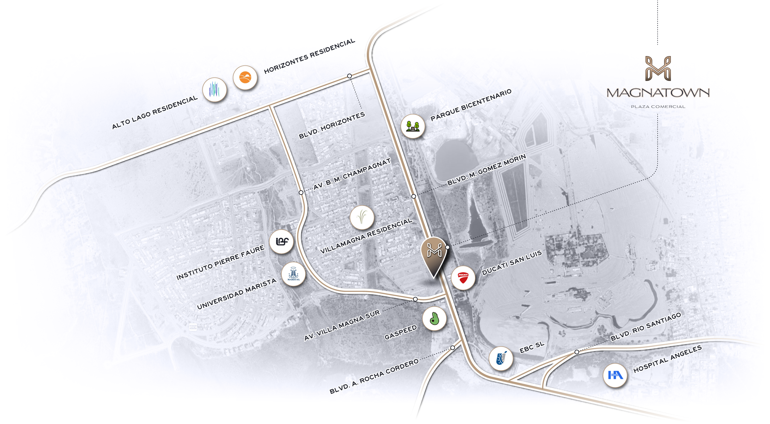 PLAZA MAGNATOWN se encuentra ubicada al poniente de la ciudad de San Luis Potosí sobre uno de los principales corredores comerciales y vía de acceso a mas de 10 privadas residenciales y comercios en un radio de 2 km ofreciendo a los residentes de la zona la comodidad de tener todo cerca.